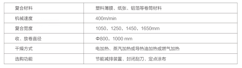 收放卷:獨立塔式雙工位收放料架,無軸氣頂裝置,換卷自動裁切,放卷EPC裝置。 涂膠:直接凹版式涂布,氣動刮刀。 烘箱:三段頂開式高效恒溫干燥箱,整個烘箱采用負(fù)壓.............